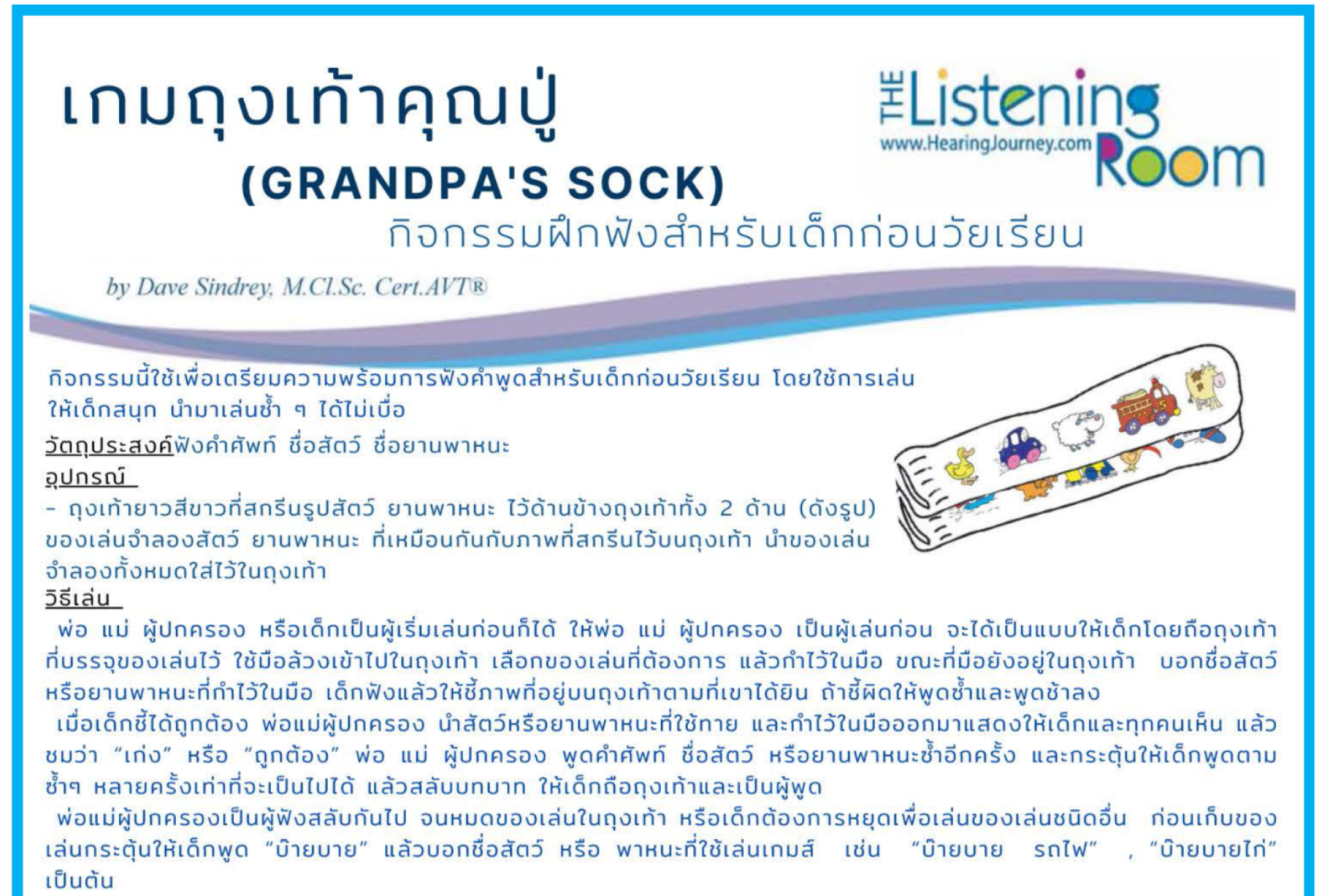 แบบฝึกพูดฝึกฟังภาษาไทย Listening Room Thai Language สำหรับผู้ปกครองใช้ในการฝึกบุตรหลาน/เด็กก่อนวัยเรียน ที่มีความบกพร่องทางการได้ยิน และใส่เครื่องช่วยฟังหรือผ่าตัดประสาทหูเทียม #ฉบับที่ 2 "เกมถุงเท้าคุณปู่" กิจกรรมฝึกฟังสำหรับเด็กก่อนวัยเรียน