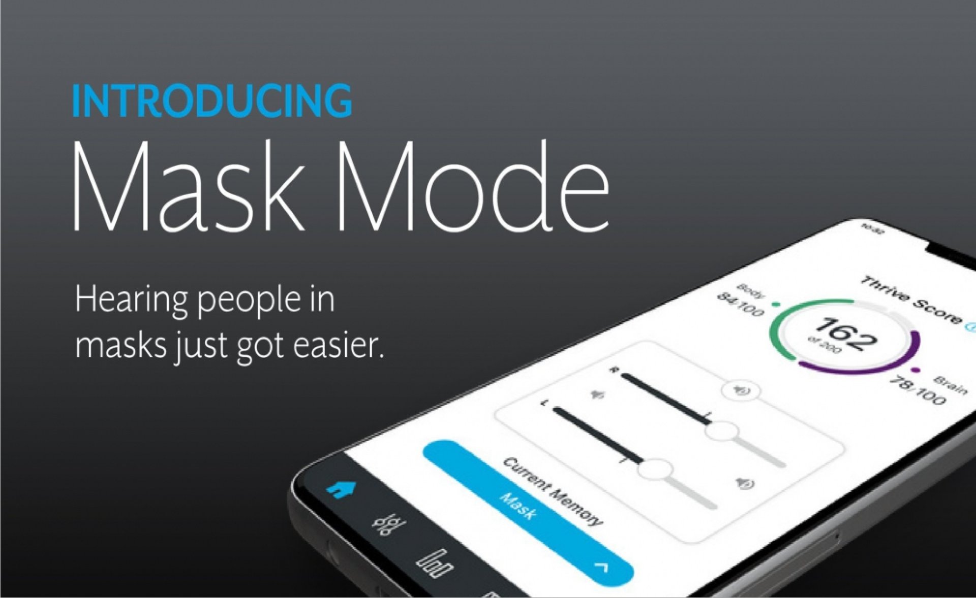 โหมดหน้ากาก (Mask Mode) ใหม่ของเรา ได้รับการออกแบบมาเพื่อช่วยให้การฟังผู้พูดที่กำลังสวมหน้ากาก เป็นไปอย่างง่ายดายขึ้น ซึ่งโหมดหน้ากากเป็นโปรแกรมที่สามารถสร้างใหม่ได้เอง (custom memory) ใน Thrive app ของเรา เพื่อช่วยชดเชยการได้ยินเสียงพูดจากการสวมหน้ากาก โดยการเพิ่มประสิทธิภาพของเสียงพูดในย่านความถี่เสียงที่ได้รับผลกระทบ และโหมดหน้ากากมีอยู่ในเครื่องช่วยฟัง Livio Edge AI เท่านั้น