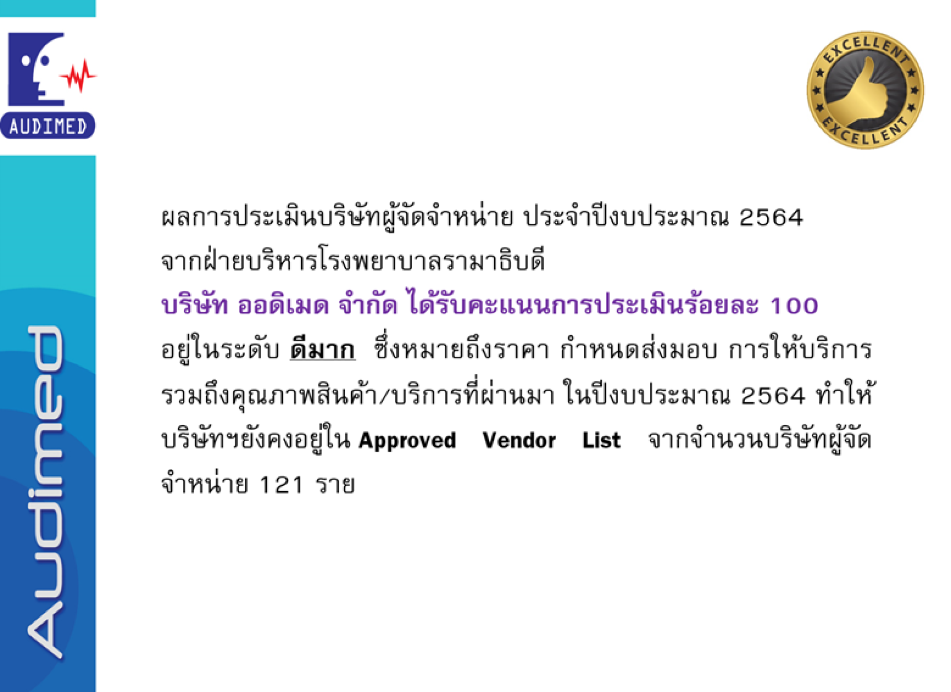 บริษัท ออดิเมด จำกัด ได้รับคะแนนการประเมินร้อยละ 100